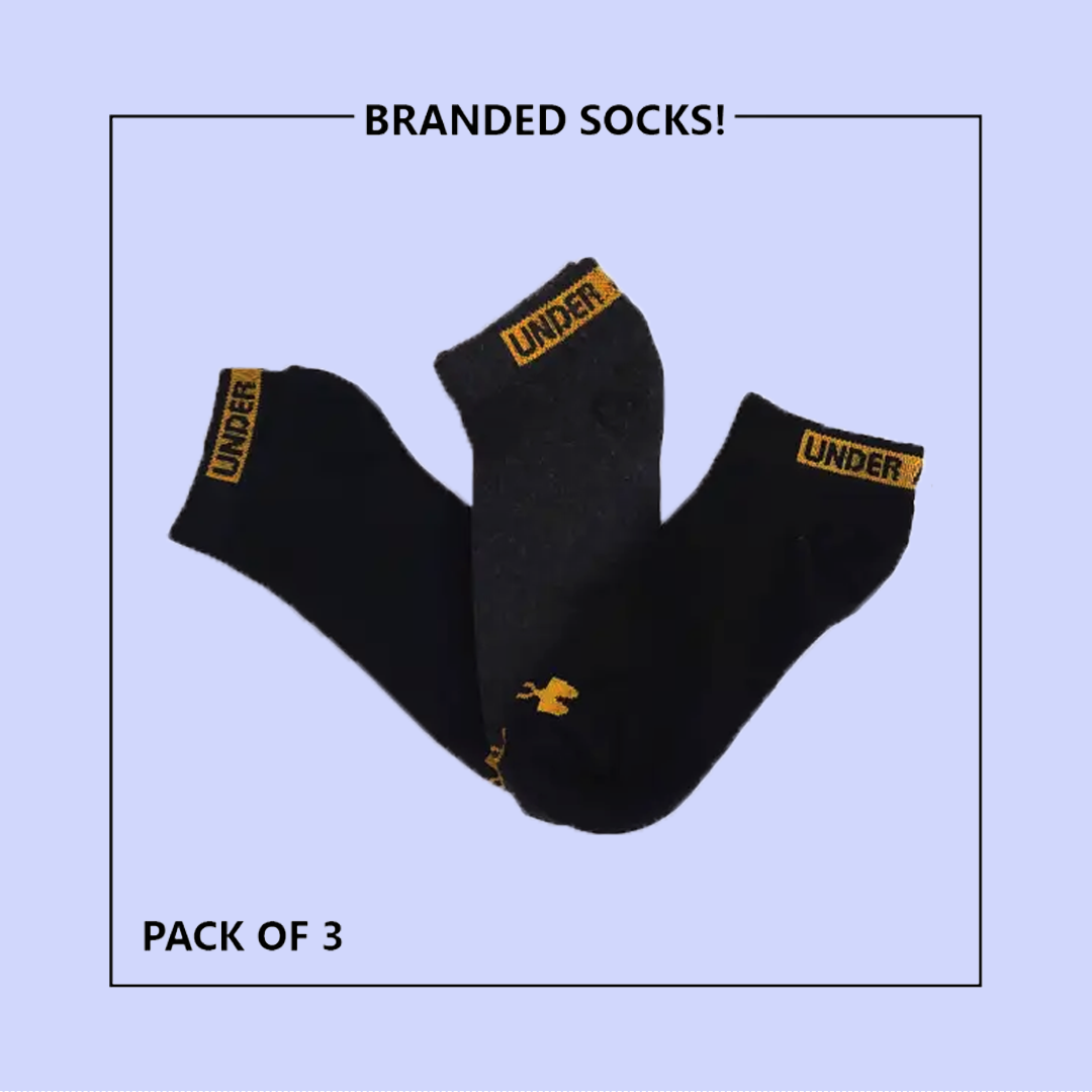 “Sporty Trio: Pack of 3 U-N-D-E-R A-R-M-O-U-R Export-Leftover Branded Ankle Moza Socks | Buy Now!”